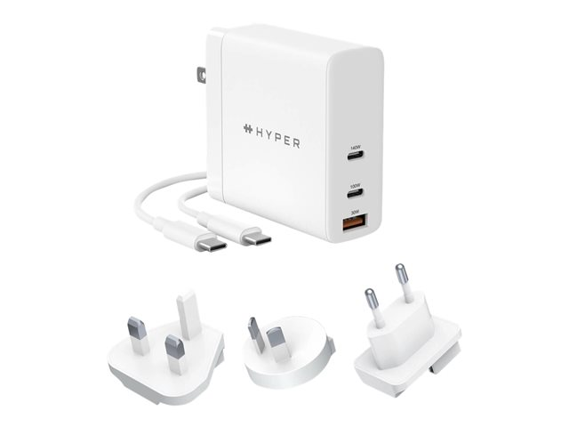 HyperJuice - Verkkosovitin - GaN-tekniikka - 140 watti(a) - Power Delivery 3.1, QC 3.0 - 3 lähtöliittimet (USB, 2 USB-C:tä) - valkoinen HJG140WW